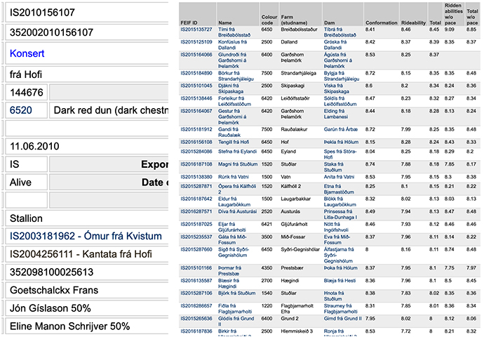 We invite you to check out all the data WF provides on Konsert and his “family”. Browse through the generations that came before him – both on his father’s and on his mother’s side (2-time Landsmót Champion Ómur frá Kvistum and 1st-Prize mare Kantata frá Hofi who has several 1st-Prize offspring in her own right) – and find out more about his own sons and daughters.